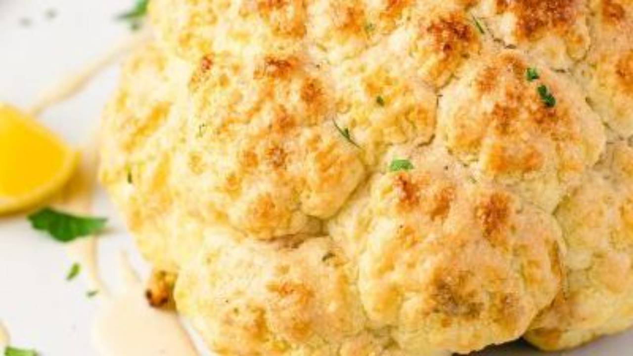 Whole roasted cauliflower with zesty lemon tahini. Simple, flavorful, and perfect as a vegan main or side dish anyone will love!
