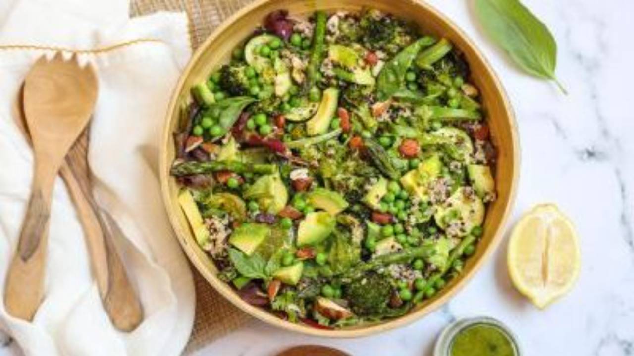 A hormone-friendly super green salad with quinoa, roasted veggies, avocado, and a fresh herb dressing. Nutritious, satisfying, and easy to make!